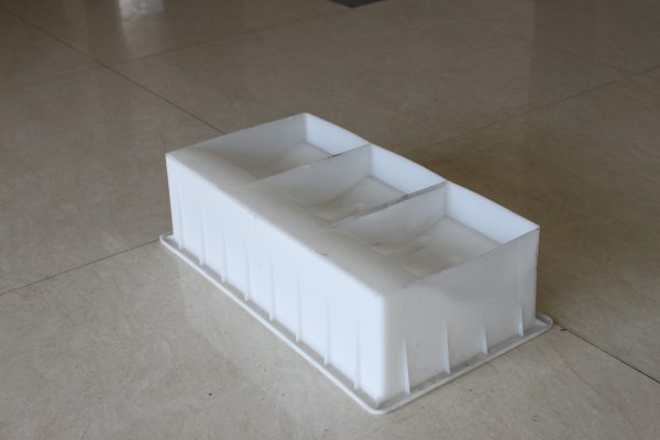 路牙石塑料模具整體外觀為長方形結(jié)構(gòu),因其尺寸較大,在模具的周邊及底部分別做了加強筋設(shè)計以保證在實際水泥路牙石澆筑過程中的穩(wěn)定性。從模具內(nèi)部的結(jié)構(gòu)我們可以看出,塑料路牙石模具主要采用了S型坡面設(shè)計,六個塑料堵頭,即所制水泥路牙石的六個排水孔,實際應(yīng)用較多的道路段為易積水或地理位置較低區(qū)域。