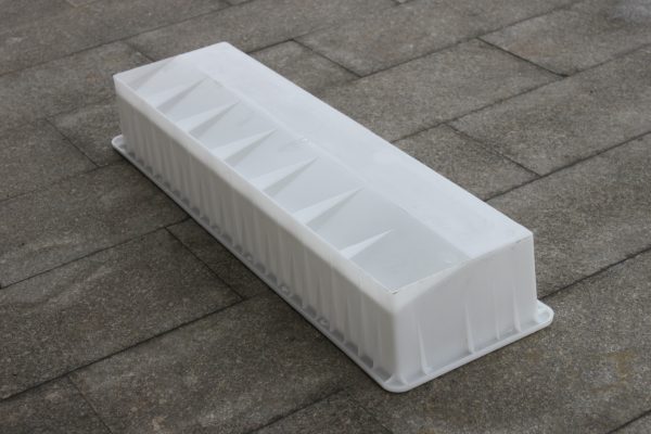 坡型設計的公路路牙石模具,其中路沿鋪設一邊呈小圓弧R2設計,有效降低撞擊力度,減小破損幾率。由于此塑料路牙石模具規格較長,正好一米,在實際采用公路路牙石模具澆筑水泥路牙石時所受水泥混凝土壓力較大,所以在塑料模具四周均采用加強筋加固,防止膨脹變形。