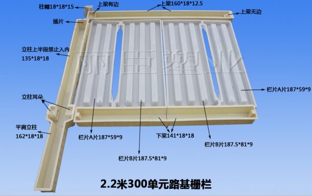 3.最后采用PP塑料的高鐵防護(hù)柵欄欄片模具,一樣有4個(gè)組成部分,尺寸分別為: