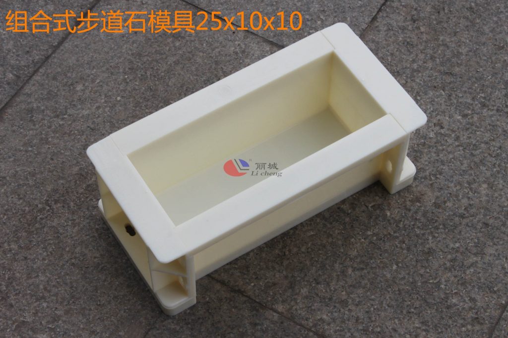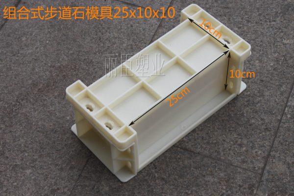 其塑料模具本身的規(guī)格的25x10x10cm,而堵在模具兩邊的堵頭規(guī)格為10x10cm。這樣的設(shè)計(jì)主要是對于步道石模具在澆筑成型后脫模過程中較為便利,只需將固定組步道石模具的鎖扣進(jìn)行拆除后,便能較為便利的進(jìn)行模具的脫模,所以麗臣在對著款模具上取名為組合式步道石模具。