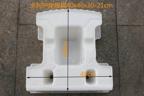 這款水利護坡模具在外觀設計上與往常的六角護坡模具稍有些不同,這款護坡模具主體外觀上主要呈現上小下大的形狀,上方較小處有設計小波浪的外觀,模具中間部位處有設計線纜的凹槽,使澆筑成型的水泥護坡磚在與線纜搭配使用上也能依舊方便。模具較大處有設計兩個預留孔,這樣的設計是為了保證生產成型的水利護岸在使用過程中能有較好的抓地力。