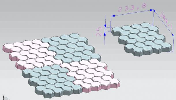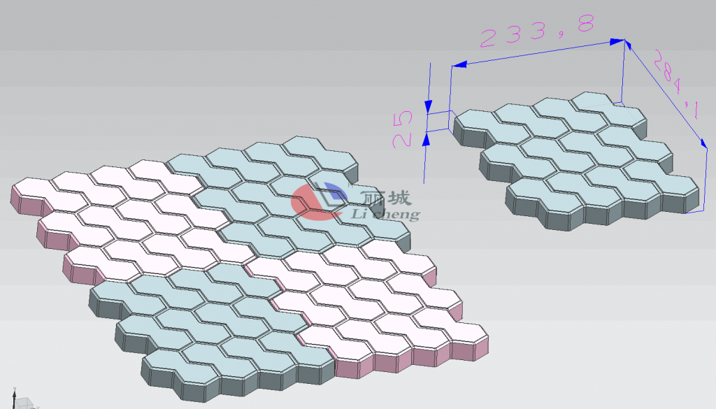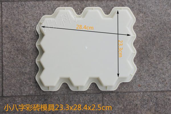 這款小八字彩磚塑料模具外觀上呈現出不規則形狀,遠處看過去外觀有些像蜂巢的樣式,彩磚模具的規格為28.4×23.3×2.5,彩磚塑料模盒在制作過程中采用全新的ABS為主要生產原料,至成型后的彩磚塑料模具外觀整體呈現一種淡鵝黃色,其模具表面能有明顯的光澤感,下面這張圖是小八字彩磚模具澆筑成型后的模型款式。