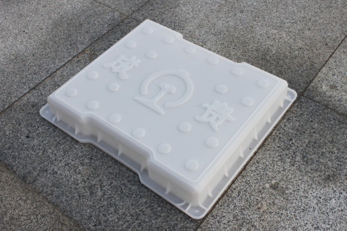 鐵路蓋板模具中圓點設計可以有效的起到步行防滑作用,鐵路圖標及“成貴”字樣標示此款產品為中國鐵路成貴高鐵線專用溝蓋板塑料模具。