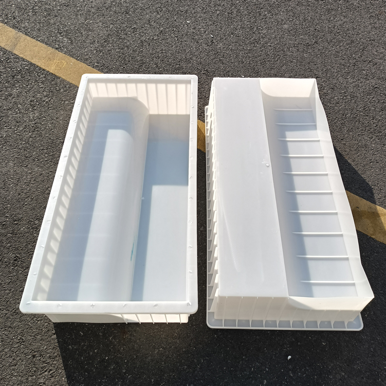 路緣排水溝塑料模具產品,主要是路緣石預制,二維尺寸設計圖如下,主要是市政道路、小區使用。預制成品模具可重復多次使用。