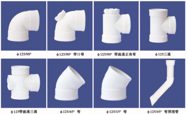 Φ125/90°彎頭,Φ125/90°帶口彎頭,Φ125/90°帶疏通正角彎頭,Φ125三通,Φ125帶疏通三通,Φ125/45°彎管,Φ125/15°彎管,Φ125/45°彎預埋管,Φ125*200*8下接管,Φ125外接管箍,Φ125直管,Φ160*300*8、Φ160*400*8、Φ160*510*8預埋管,Φ125*300*8斜底、平地預埋管,Φ125*400*8、Φ125*510*8預埋管,Φ170*38管蓋,Φ135*38管蓋,200*250*10管篦,250*200*10管篦,200*150*10、200*150*20管篦及Φ125吊卡管卡等多種配件。